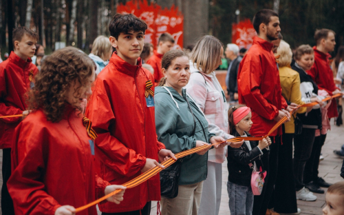 Георгиевская лента, как символ памяти великого подвига, объединила всех присутствующих, словно нить, связующая прошлое и настоящее. Она растянулась яркими, прочными лучами в будущее, трепетно удерживаемая в руках молодого поколения.