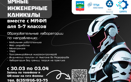 Приглашаем учащихся 5-7 классов провести свои каникулы с пользой в нашем "Умном инженерном лагере", который будет организован на базе ТТИ НИЯУ МИФИ с 30 марта по 03 апреля.