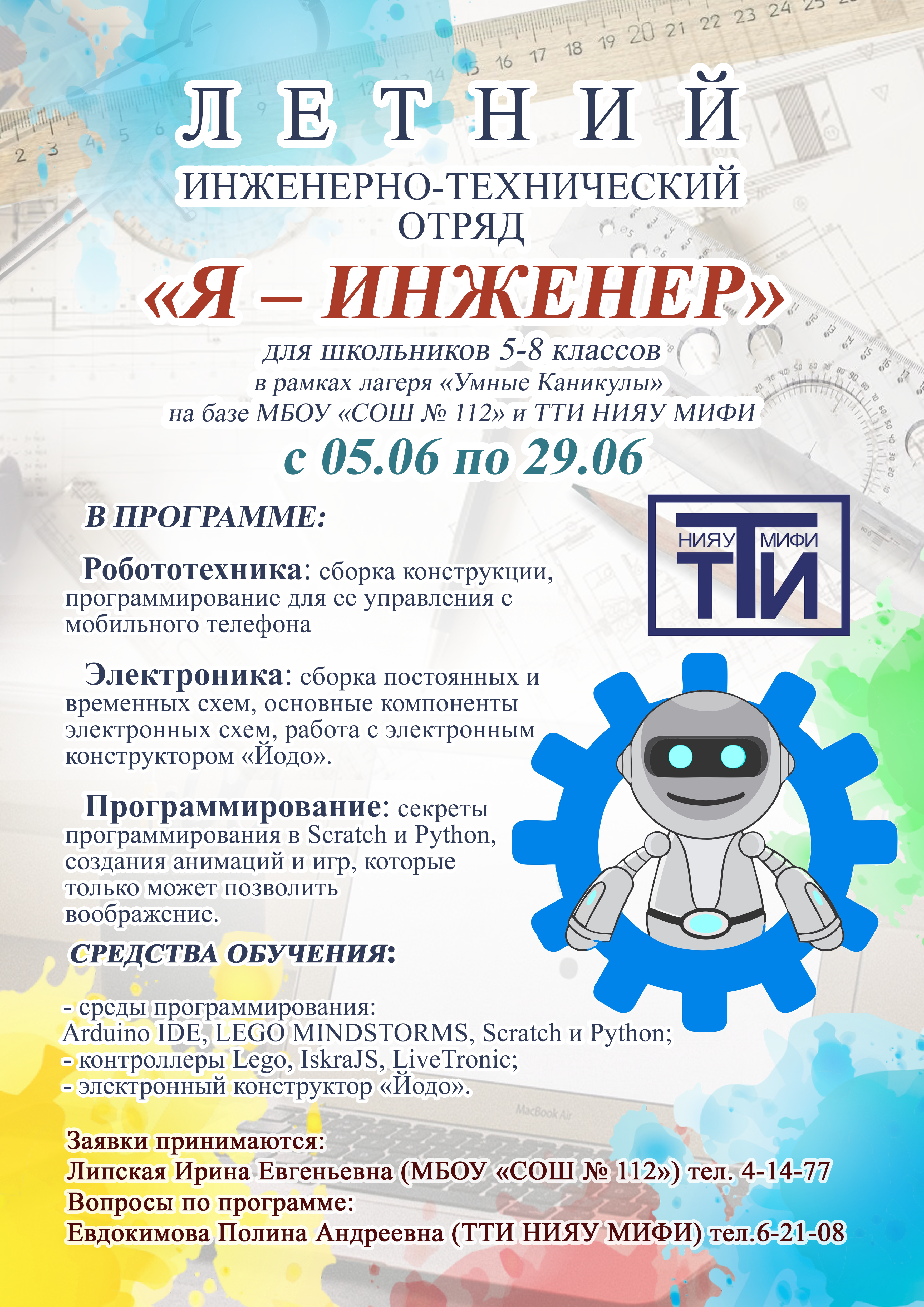 Приглашаем учащихся 5-8 классов в ЛЕТНИЙ инженерно-технический отряд «Я – инженер», который будет организован в рамках лагеря «Умные каникулы» на базе ТТИ НИЯУ МИФИ и МБОУ «СОШ № 112» с 05 июня по 29 июня 2018 года.