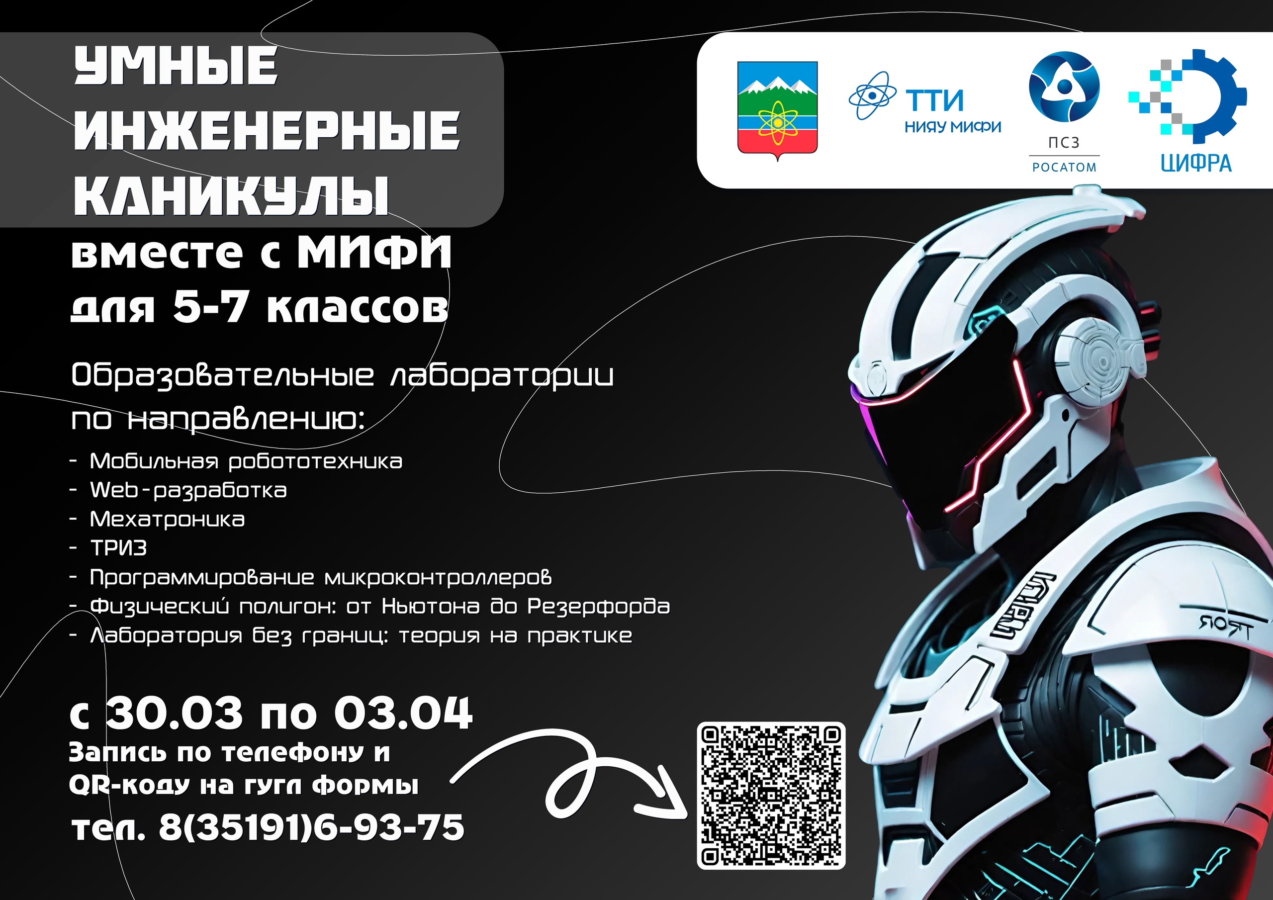 Приглашаем учащихся 5-7 классов провести свои каникулы с пользой в нашем "Умном инженерном лагере", который будет организован на базе ТТИ НИЯУ МИФИ с 30 марта по 03 апреля.