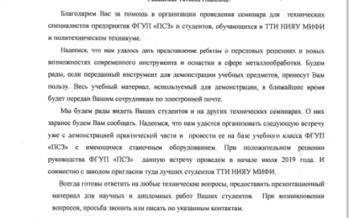 Благодарственное письмо о взаимном сотрудничестве с ТТИ НИЯУ МИФИ от крупнейшей компании ООО "Спецпроминструмент"