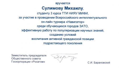 Благодарностями за участие награждены студенты высшего образования ТТИ НИЯУ МИФИ Сулимов Михаил, Труфанов Данил, Мащенко Максим.