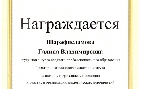 Студенты старших курсов ТТИ НИЯУ МИФИ Алена Зайцева и Галина Шарафисламова были награждены за активную жизненную позицию, организацию волонтерской деятельности в сфере экологии грамотой Министерства экологии Челябинской области и подарками. Ни одно волонтерское мероприятие или акция г. Трехгорный не обходится без участия волонтеров «Службы добрых дел» ТТИ НИЯУ МИФИ. Одно из главных направлений работы студентов  – эковолонтерство.