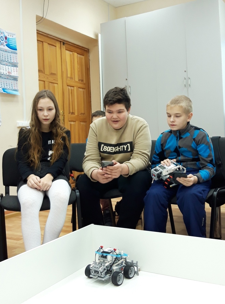 Школьники 1-го и 2-го года обучения несколько месяцев были погружены в изучение программирования роботов на примере блока ЕV3 в среде LEGO Mindstorms. Первичным было изучение на учебных роботах базовых навыков, заставляющих робота двигаться по заданной траектории, далее, усложняя задачу, ребята учились создавать для роботов программу восприятия окружающего мира с использованием различных датчиков. Заключением освоения образовательного модуля стала самостоятельная проектная работа обучающихся по конструированию собственного робота произвольной конструкции с заданными ограничениями по размеру и массе, который мог бы участвовать в соревнованиях.