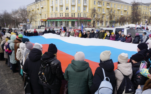 В заключение пробега, состоялся флешмоб «РОССИЯ – КРЫМ – ДОНБАСС» в поддержку спецоперации Вооруженных сил РФ и участники растянули полотнище цвета российского флага.