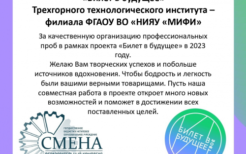Команда ТТИ НИЯУ МИФИ получила Благодарность от Регионального оператора федерального профориентационного проекта «Билет в будущее» за качественную организацию профессиональных проб для школьников города.